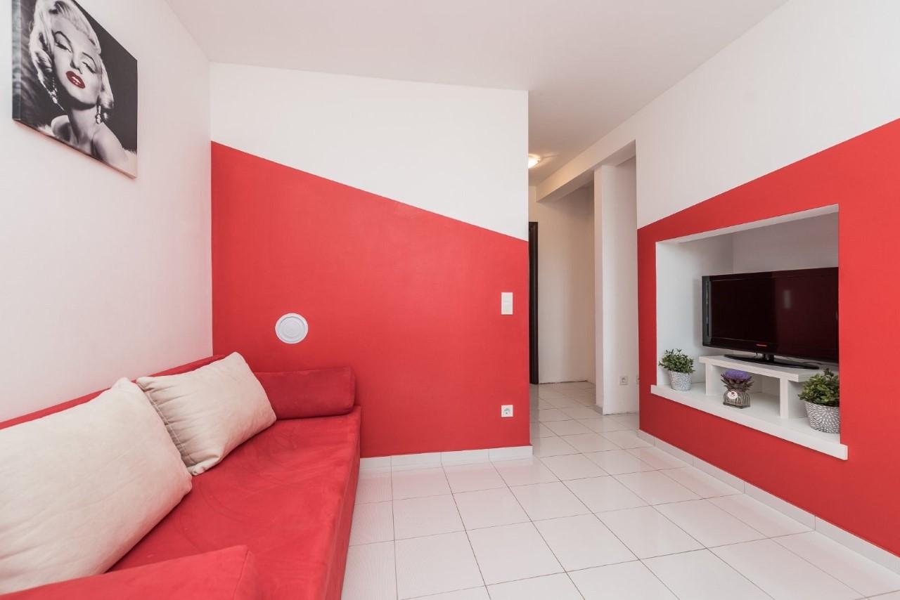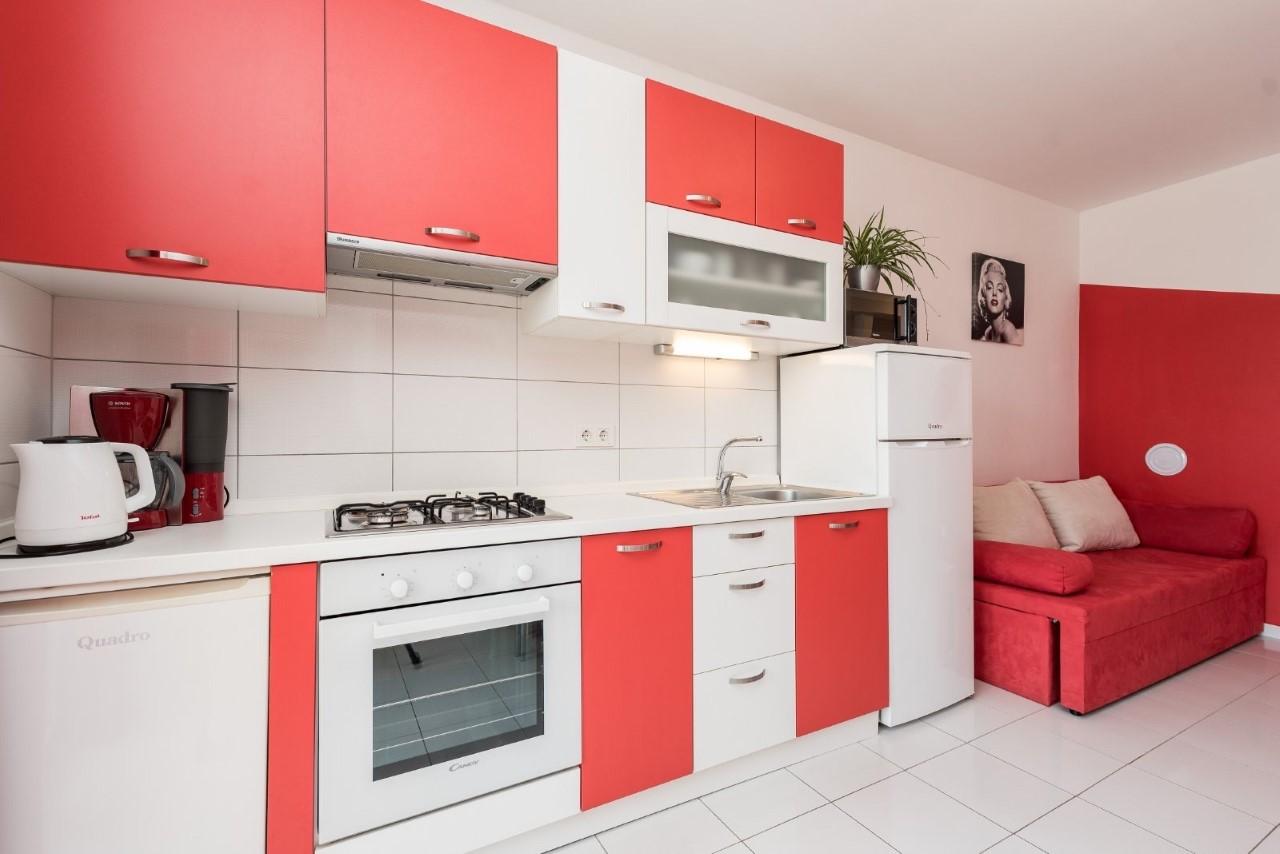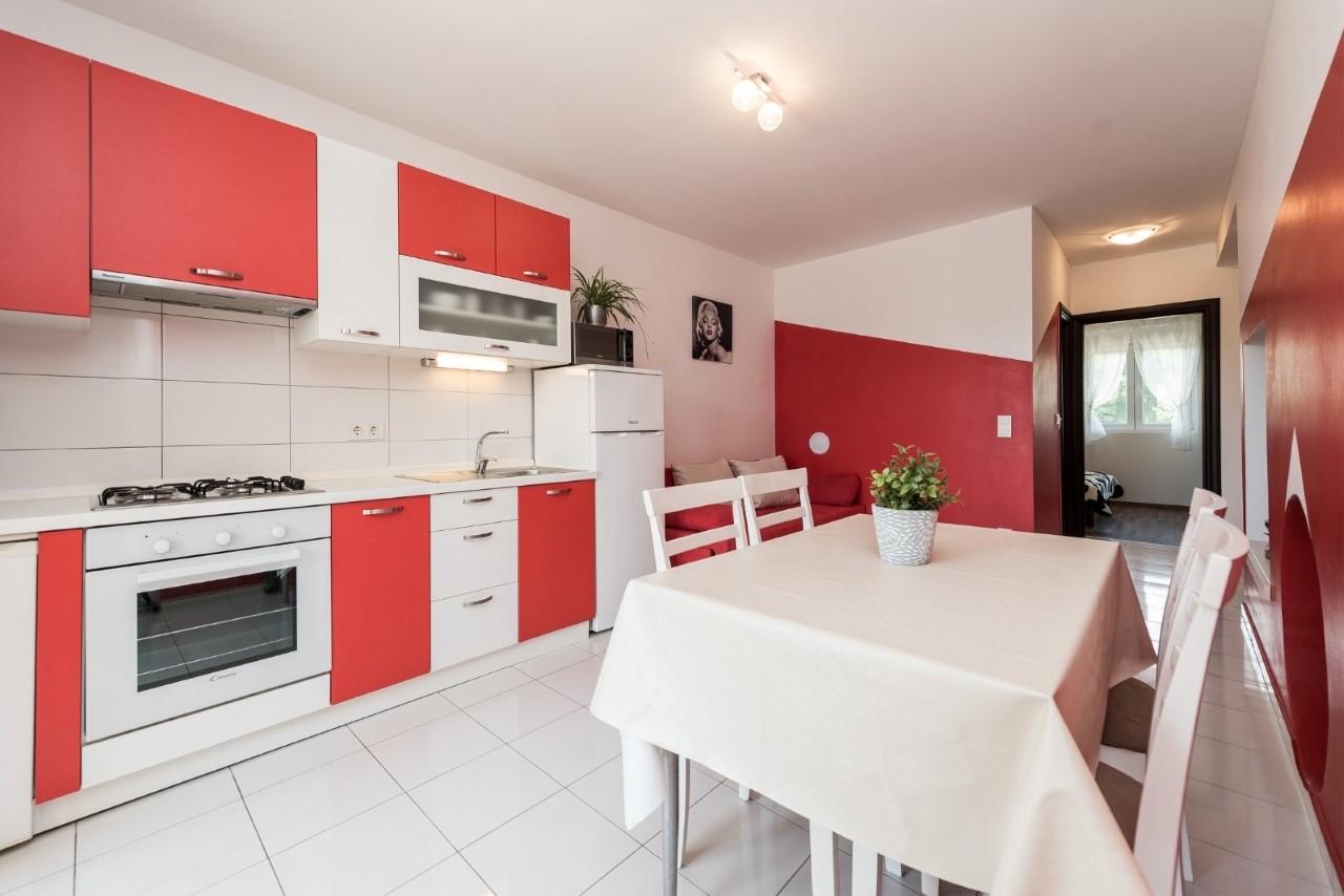 Das Apartment Kim Red ist die perfekte Wahl für die Unterbringung von bis zu vier Personen und bietet eine Kombination aus Komfort und modernem Design. Auf 50 m² gibt es ein Schlafzimmer mit Doppelbett, ein Wohnzimmer mit Schlafsofa, eine voll ausgestattete Küche mit Esstisch, ein Badezimmer mit Dusche und einen kleinen privaten Balkon, der einen idealen Ort für einen Morgenkaffee oder ein Abendessen bietet Abendruhe. Dank der sorgfältig gestalteten Räumlichkeiten und modernen Einrichtungen sorgt das Apartment für einen angenehmen und erholsamen Aufenthalt.