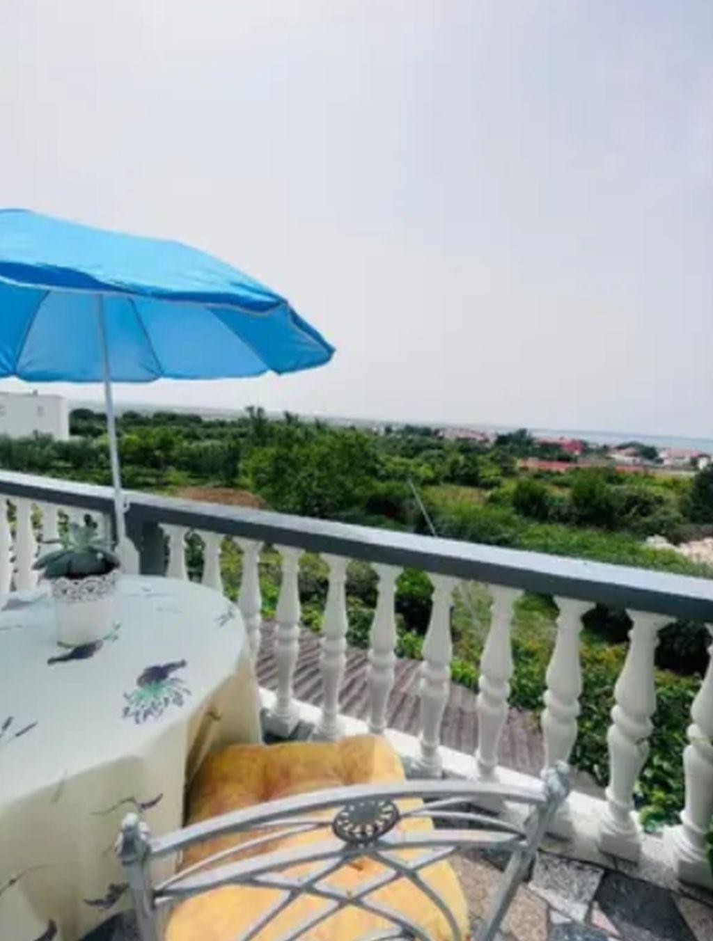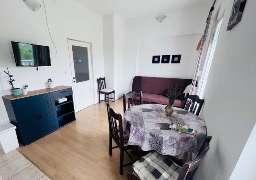 Die Ein-Zimmer-Wohnung für 4 Personen befindet sich im ersten Stock. Sie verfügt über ein Schlafzimmer mit einem großen Doppelbett sowie ein Schlafsofa für zwei Personen im Wohnzimmer. Den Gästen steht eine voll ausgestattete Küche mit Geschirrspüler zur Verfügung. Die Wohnung verfügt über ein Badezimmer mit Dusche, ein Wohnzimmer und einen Balkon mit Meerblick und Gartenmöbeln. Sie ist mit einer Waschmaschine, Klimaanlage und Internet ausgestattet. Der komplett eingezäunte Hof steht zur Nutzung bereit, zusammen mit allen Annehmlichkeiten (Grill, Parkplatz, Kinderspielplatz).