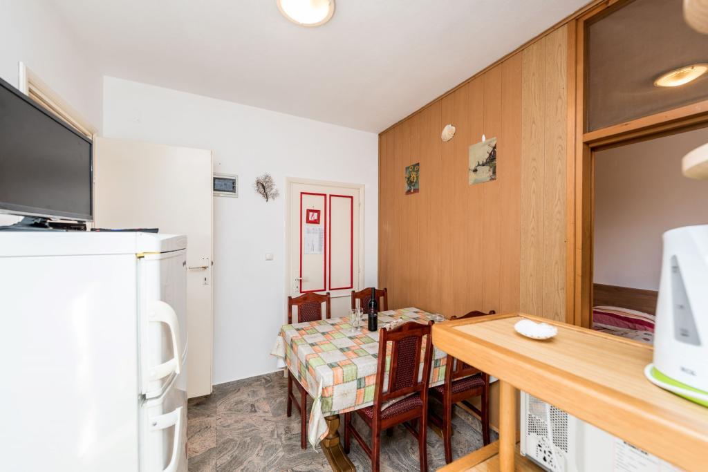 Die Erdgeschosswohnung (40 m²) bietet Platz für bis zu drei Personen (2+1) und eignet sich perfekt für einen Familienurlaub oder einen Aufenthalt mit Freunden. Das Schlafzimmer verfügt über ein Doppelbett und ein zusätzliches Einzelbett. Küche und Wohnzimmer sind zu einem funktionalen Raum verbunden, und das Badezimmer ist mit einer Dusche ausgestattet. Die Wohnung öffnet sich zu einer gemütlichen Terrasse, ideal für den Morgenkaffee oder zum Entspannen am Abend.
