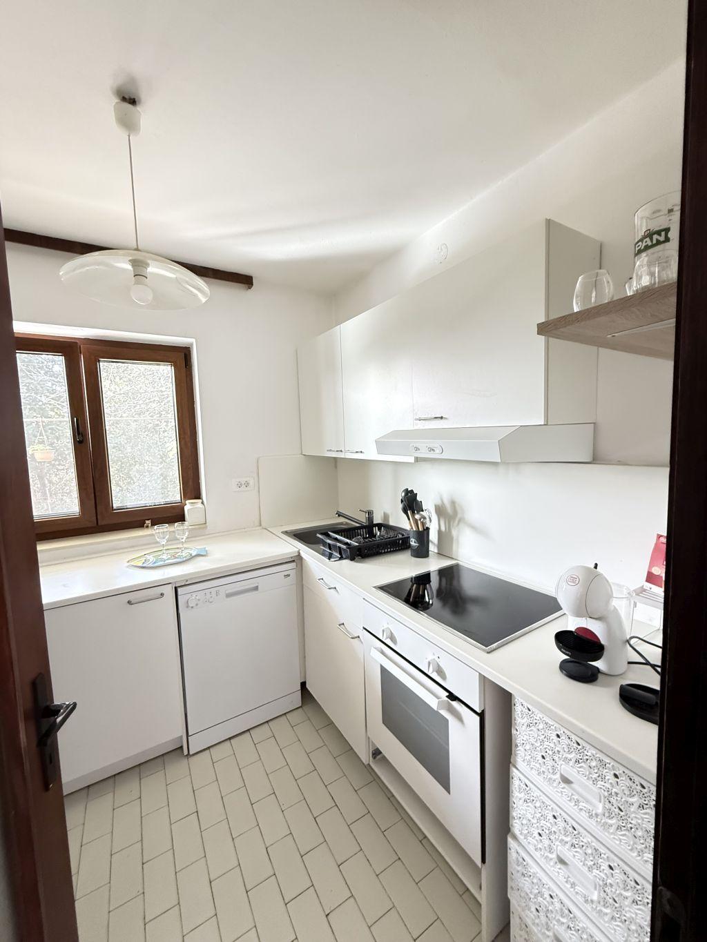 Die Küche ist mit allem ausgestattet, was zur Zubereitung von Mahlzeiten benötigt wird – darunter eine Geschirrspülmaschine, ein Wasserkocher, eine Dolce-Gusto-Kaffeemaschine, Backofen und Kochfeld.