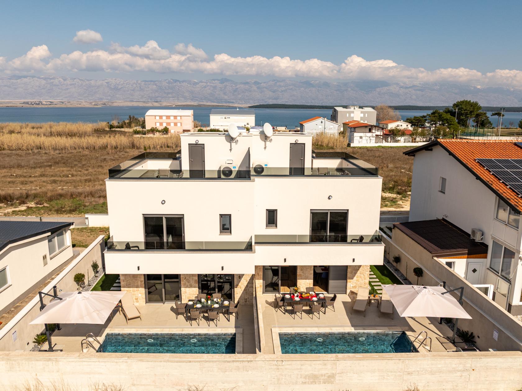 Ein besonderes Highlight der Villa ist der Wellness - und Außenbereich. Den Gästen stehen ein beheizter Salzwasserpool, eine Sauna für vollständige Entspannung sowie eine Dachterrasse mit Jacuzzi zur Verfügung, von der aus man einen wunderschönen Blick auf das Meer und den Sonnenuntergang genießen kann.