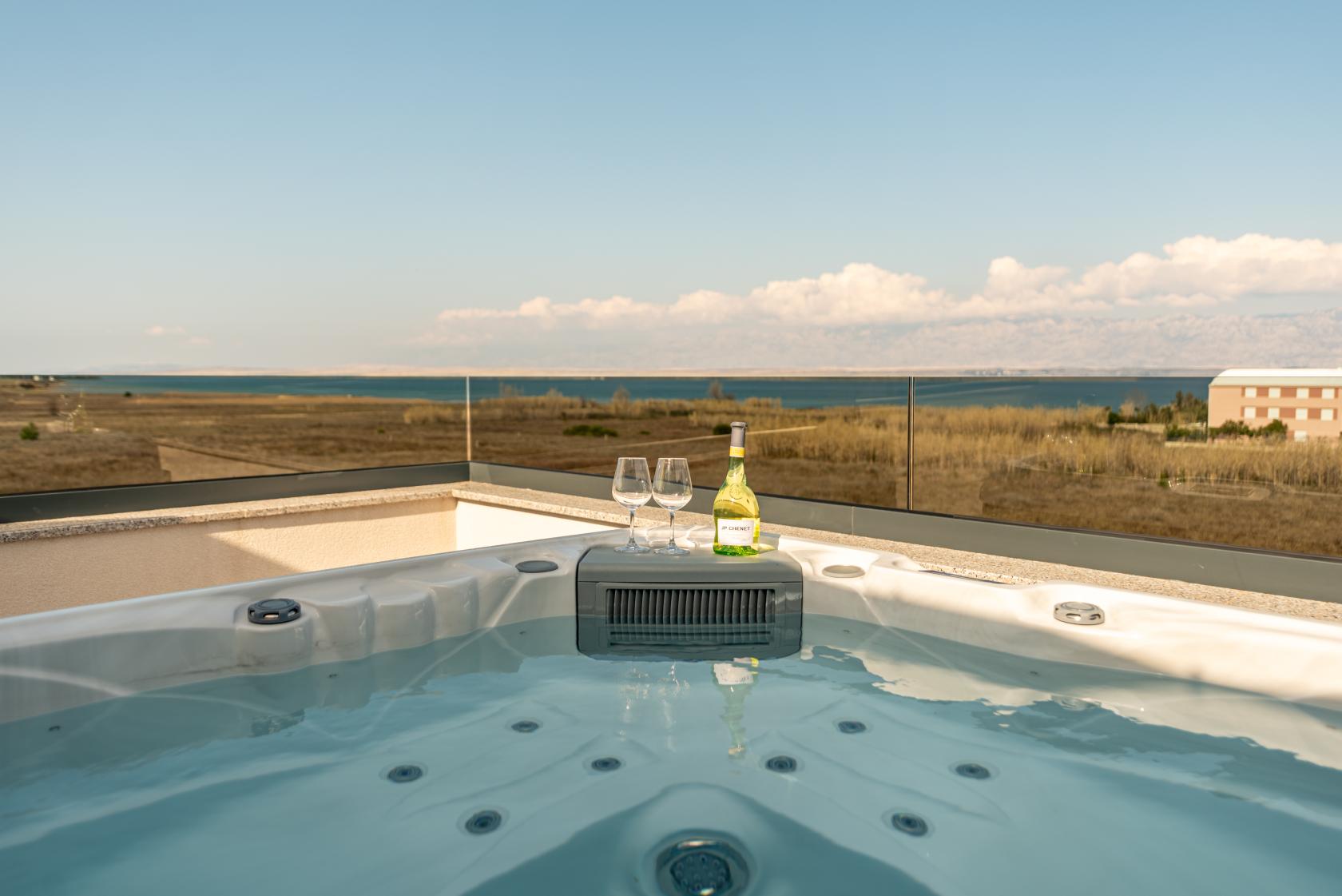 Auf der Dachterrasse befindet sich ein Jacuzzi mit Meerblick, der den perfekten Ort zum Entspannen an warmen Sommerabenden bietet.
