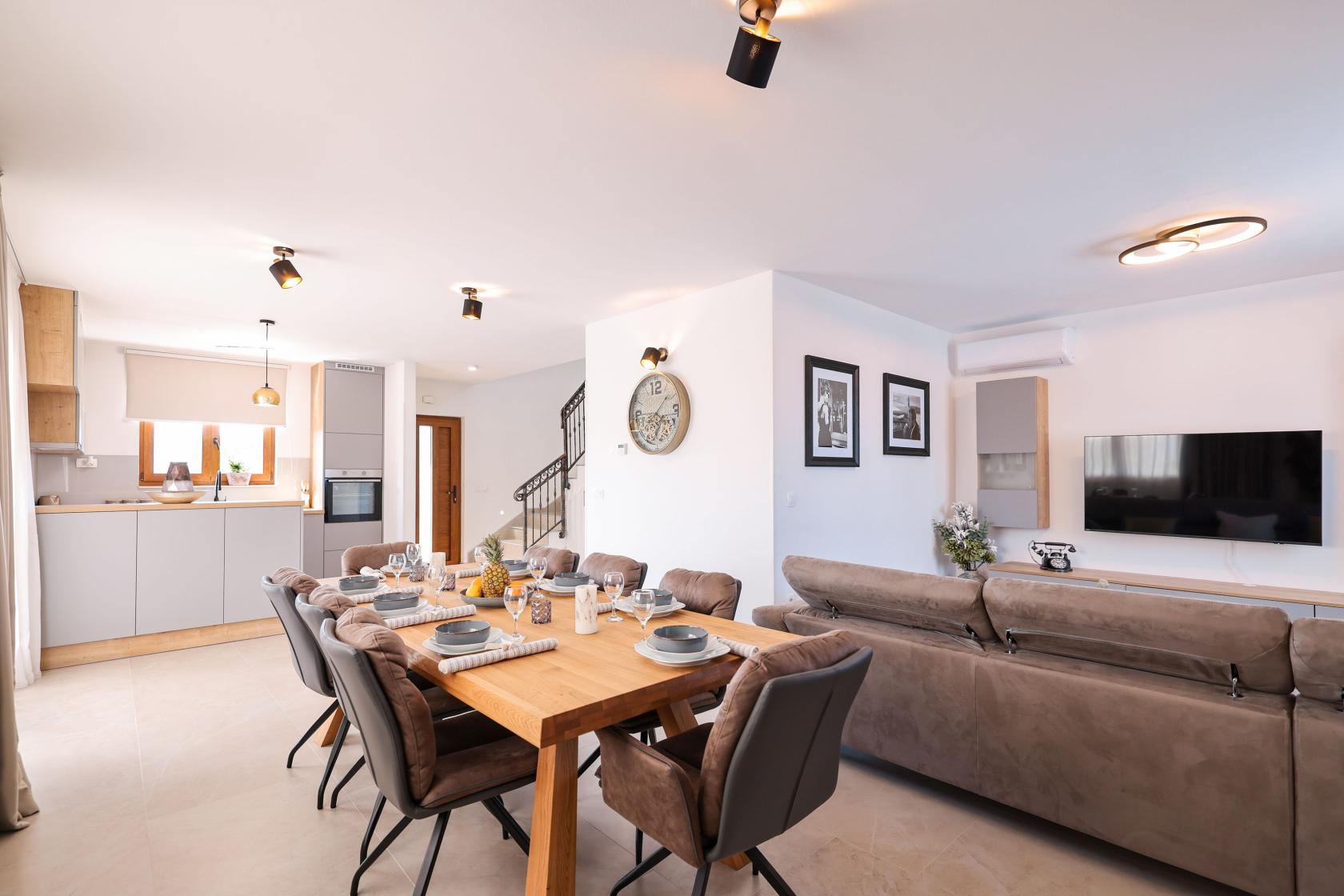 Villa ist eine modern ausgestattete Villa mit einer Fläche von 200 m2, die den Gästen ein außergewöhnliches Erlebnis bietet. Mit Erdgeschoss und erstem Stock verfügt sie über drei Schlafzimmer, wobei eines über ein eigenes Bad verfügt, während das andere sich im Flur befindet und bis zu acht Personen Platz bietet. Das Erdgeschoss bietet einen wunderschönen, geräumigen Wohnbereich mit Fernseher, eine modern ausgestattete Küche und ein offenes Esszimmer, in dem die Gäste gemeinsame Abendessen genießen können. Vor dem Frühstück können sie auf der überdachten Terrasse entspannen, die direkt vom Wohnzimmer führt. Bevor sie an den Strand gehen, der nur 150 Meter von der Villa entfernt ist, können die Gäste die Stille genießen und bei einer Tasse Kaffee im Hängesessel schaukeln. Sie haben auch komfortable Liegestühle neben dem Pool mit kleinem Wasserfall zur Verfügung, wobei ein besonderes Augenmerk auf dem gemütlichen Außenbett mit Baldachin liegt, um das sich die Gäste streiten werden. Der Garten ist angenehm beleuchtet, wenn es dunkel wird, und die Gäste können bei einem Glas Wein und den besten kroatischen Delikatessen entspannen. Haustiere sind willkommen, und die Villenbesitzer haben an jedes Detail gedacht, sodass auf Anfrage ein Kinderbett und ein Hochstuhl zur Verfügung stehen. Für Autos stehen vier Parkplätze im Schatten unter einem Vordach zur Verfügung.