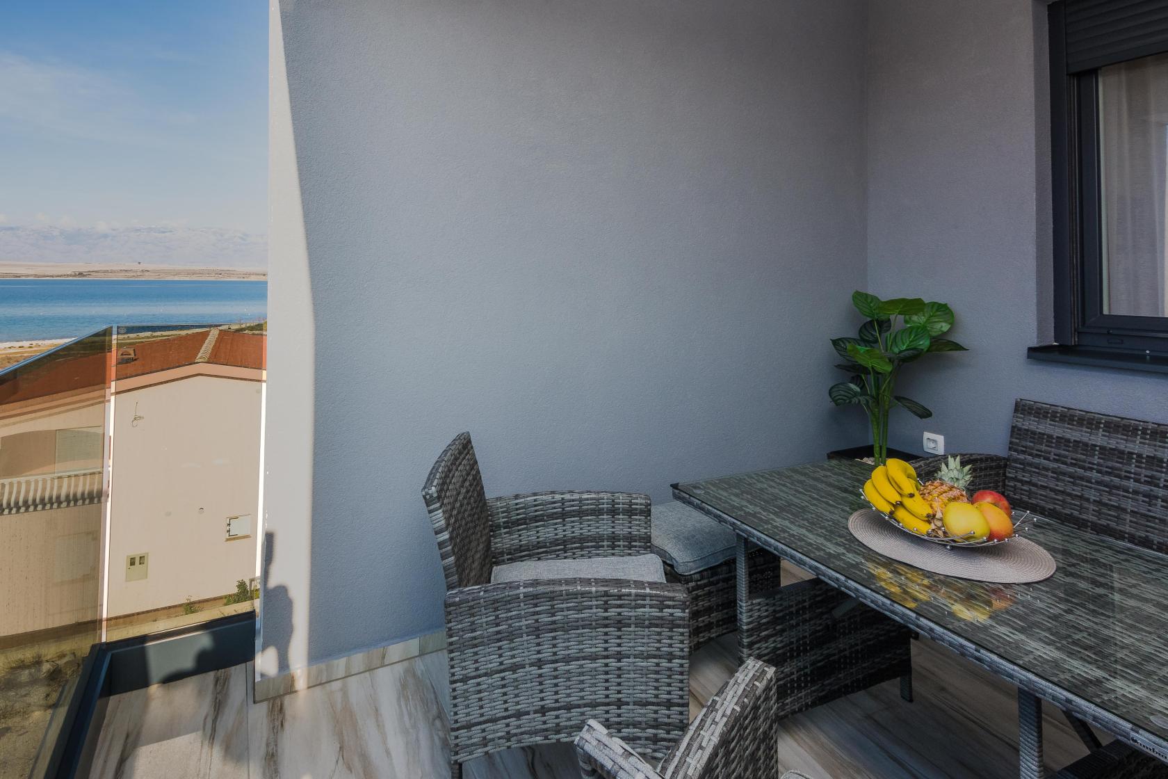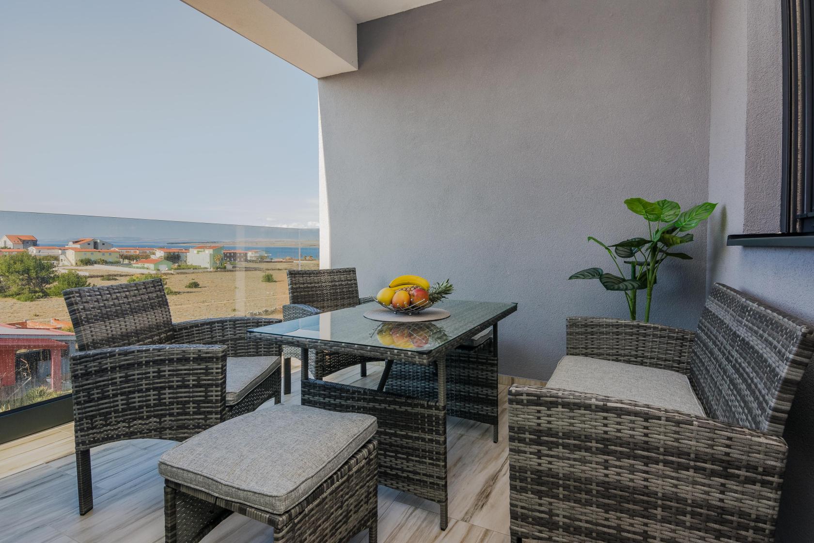 The fully equipped new apartment with two bedrooms with TV and air conditioning and two modern bathrooms can host up to four people. The apartment consists of a pleasant living room with a TV, a spacious dining room, and a separate toilet, and from the living room, there is a terrace with a wonderful view of the landscape and the sea. The kitchen is fully equipped with everything guests may need, such as a coffee machine, toaster, or dishwasher. On the terrace with comfortable outdoor furniture, guests can enjoy a morning coffee or an evening cocktail with a photogenic sunset while watching the seagulls. The entire apartment is covered with a good wi-fi network, and guests have free and safe parking in front of the building. This unique accommodation offers guests an ideal combination of comfort and luxury, providing them with a pleasant experience of enjoying a relaxing and active vacation.