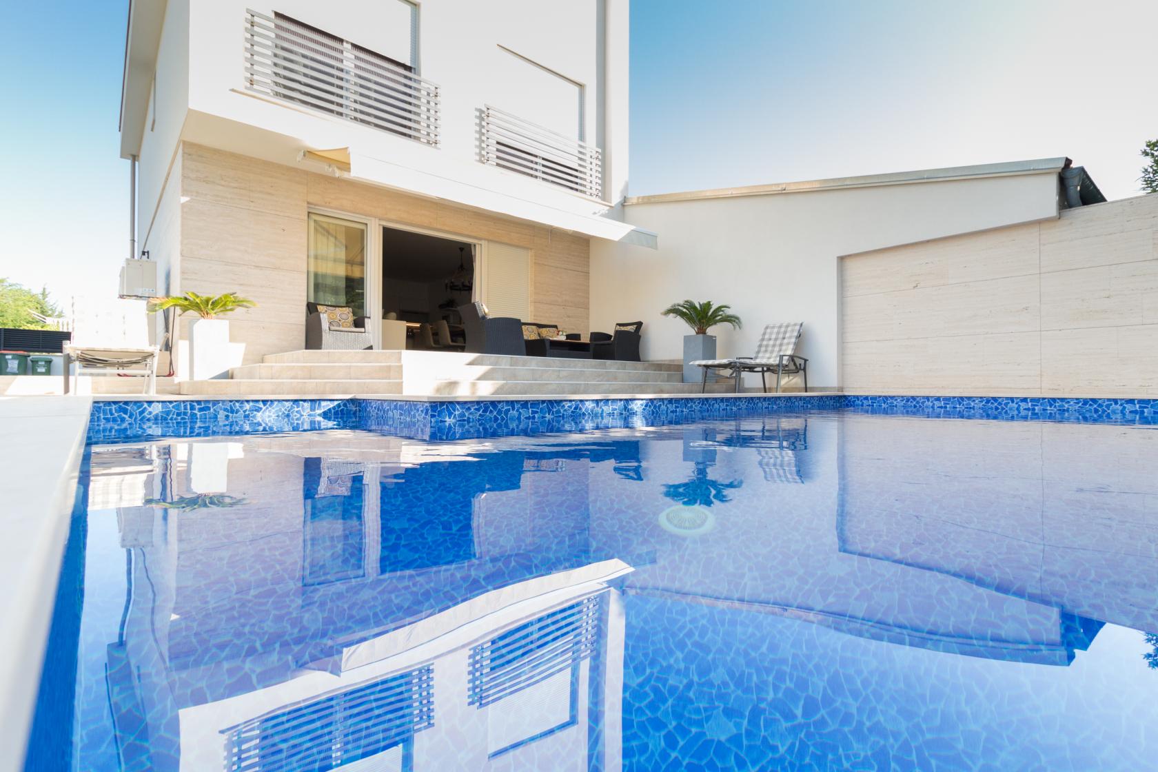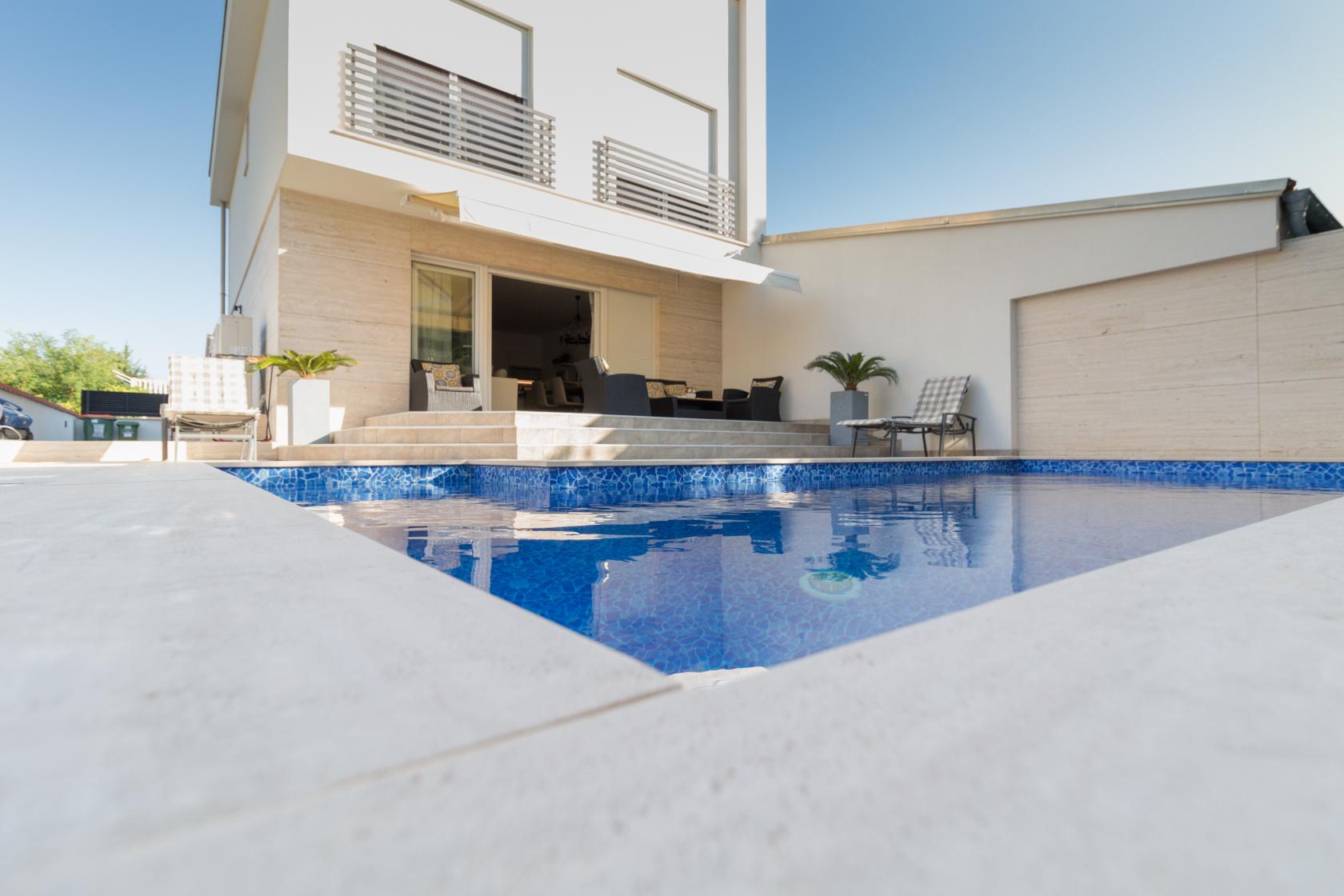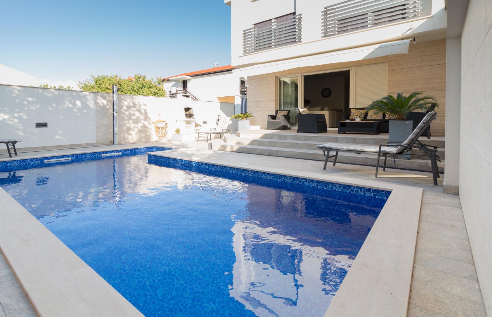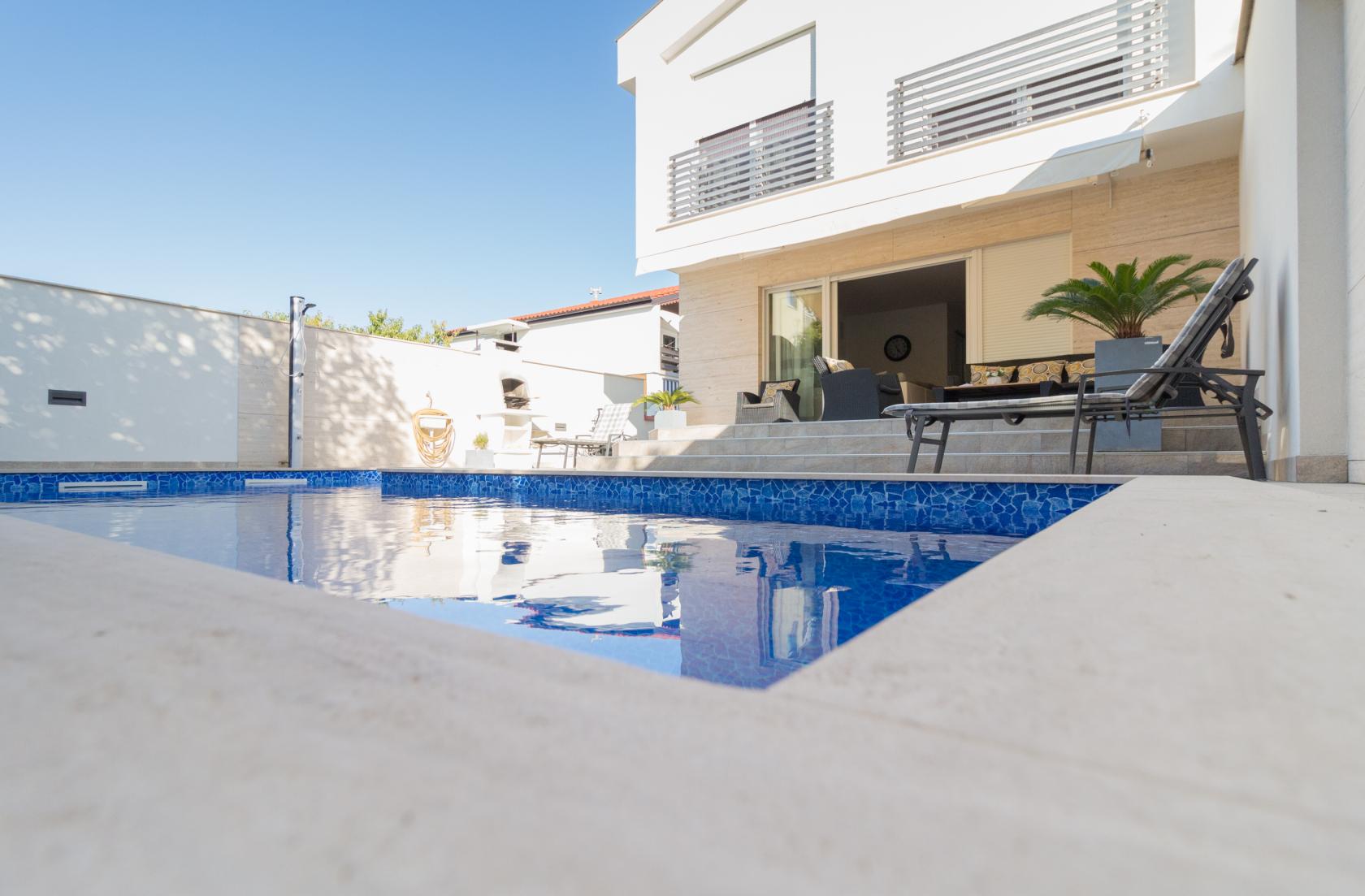 Vila Ema nudi potpunu privatnost i mir u mirnoj stambenoj četvrti, uz ograđeno dvorište s privatnim bazenom i natkrivenu terasu s lounge prostorom, savršenu za opuštanje tijekom dana i večernja druženja.