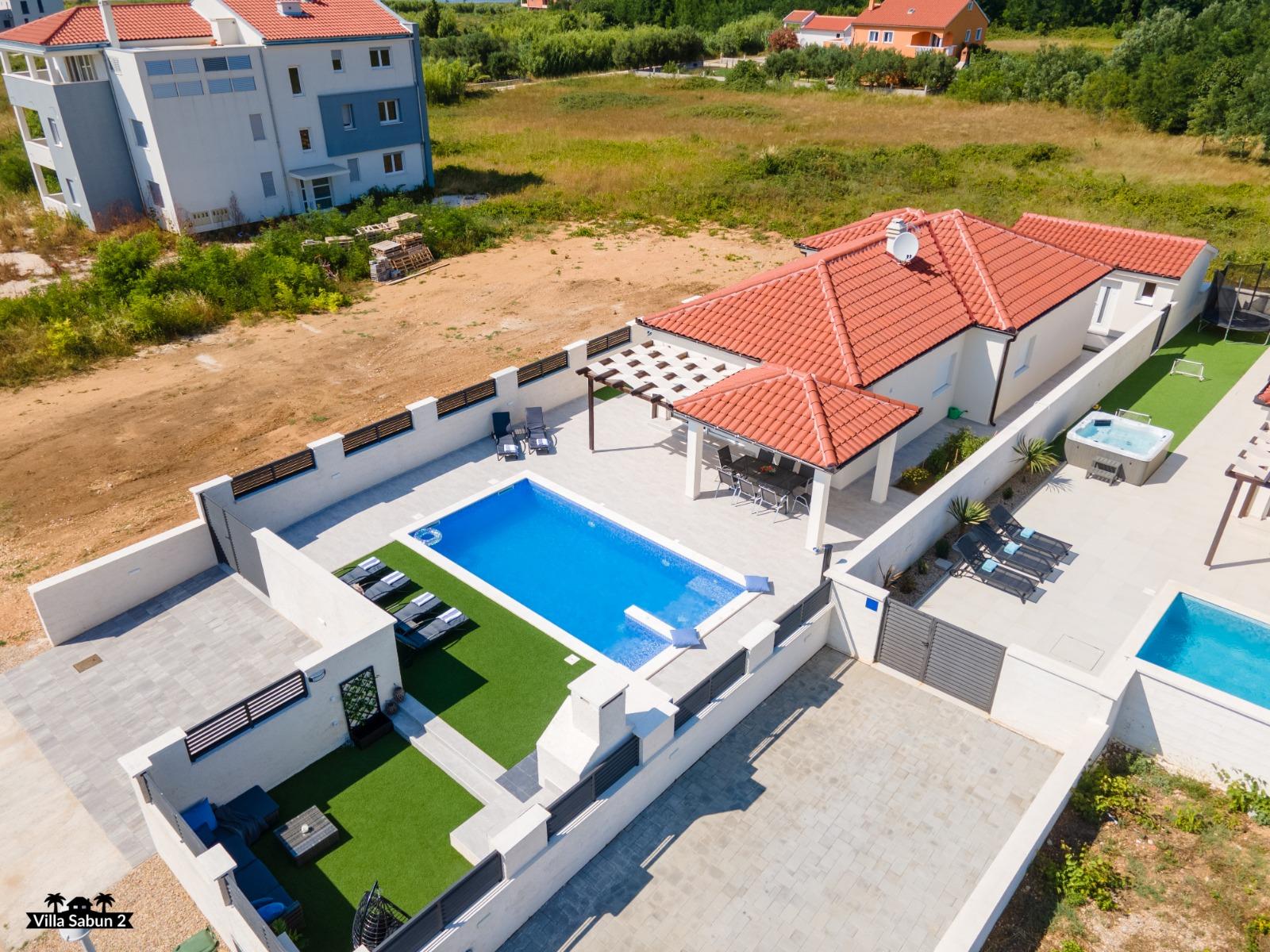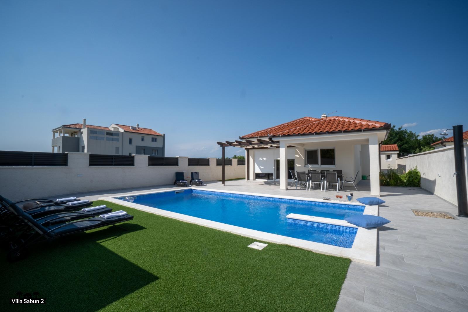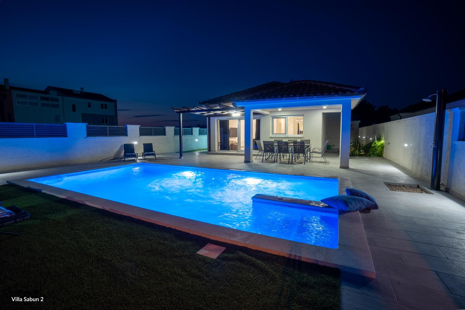 Vila Sabun predstavlja moderno opremljenu kuću koja pruža izvanredno iskustvo obiteljima i prijateljima. S površinom od 120 m2, tri spavaće sobe i kaučem na razvlačenje za dvije osobe može ugostiti do osam osoba. Vila se prostire na dnevni boravak, dvije kupaonice i potpuno opremljenu kuhinju. Gosti će neometano uživati u jutarnjoj kavi na natkrivenoj terasi, a ako se žele rashladiti, dovoljna je napraviti samo pet koraka da uskoče u privatan vanjski bazen sa slanom vodom. Bazen je osvjetljen po noći i daje ugodno osvjetljenje. Za savršen kraj dana, gosti se mogu družiti uz roštilj koji mogu iskoristiti za “ribe na gradele”, poznati dalmatinski