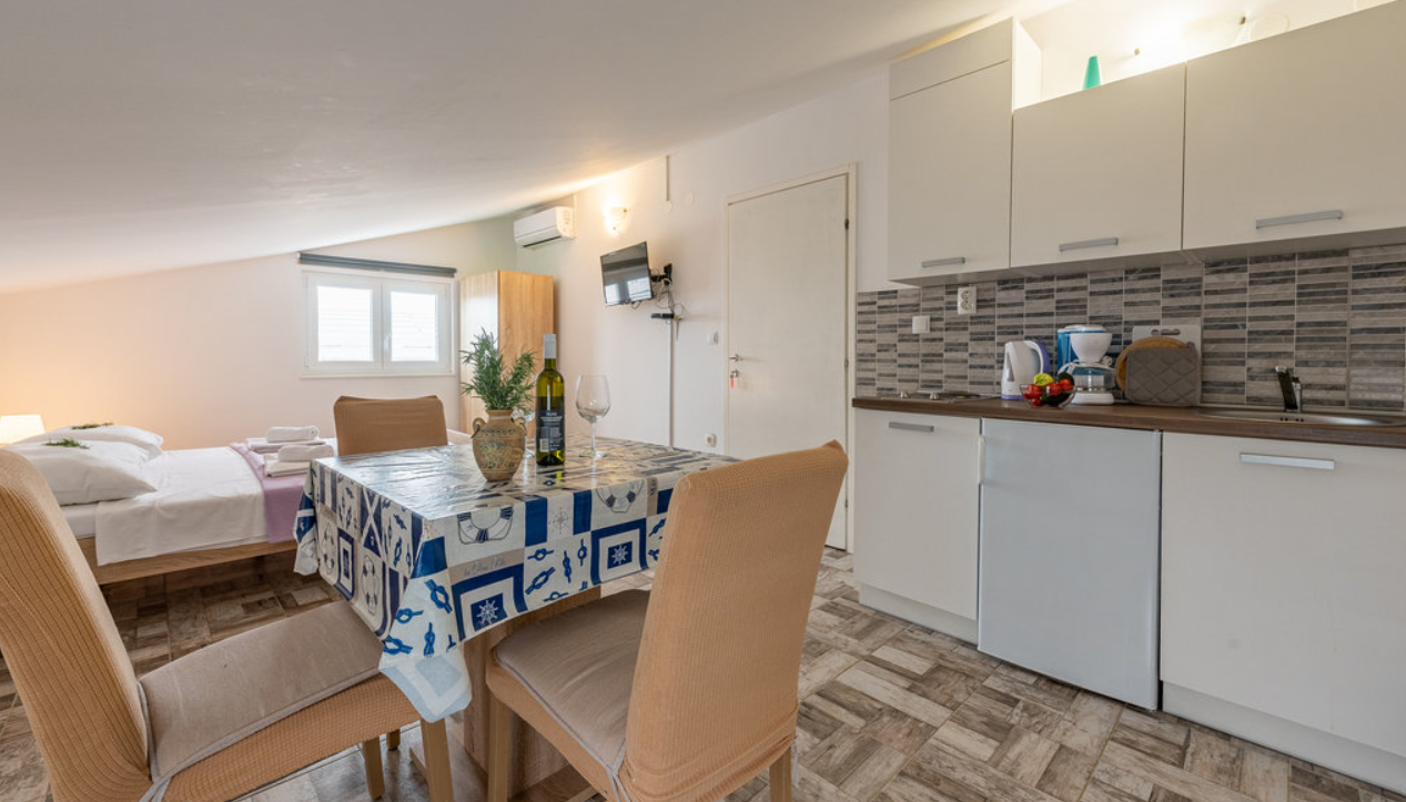 Studio apartman u Vrsima smješten je na prvom katu obiteljske kuće i prostire se na 25 m², idealan za dvije osobe koje traže mir tijekom odmora. Apartman se sastoji od bračnog kreveta, kuhinje, kupaonice s tušem, TV-a, klima uređaja i besplatnog Wi-Fi-ja.