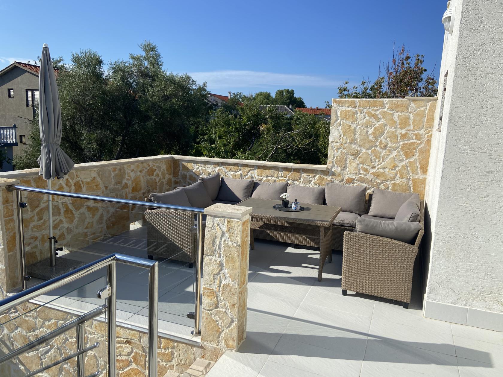 - Veranda u dvorištu s vanjskim namještajem i grillom djeli se s gostima iz drugog apartmana.